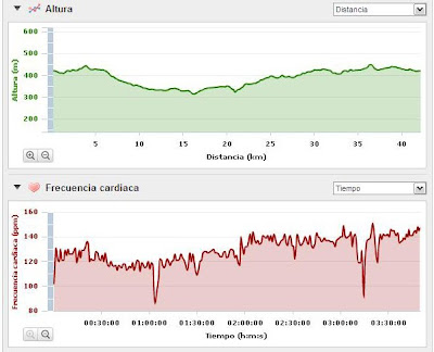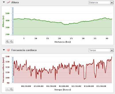 Día larguisimo y estresante. Me he levantado sobre las 6:15 de la mañana y para las 7:30 ya estaba callejeando, despues de dar varias vueltas esperando a que amaneciese he salido por la general hacia la gasolinera de Pitillas, después Pitillas, Beire y he regresado por Olite a Tafalla. Al llegar a Tafalla aun me quedaban cinco kilómetros, así que he dado una vuelta por los alrededores y he completado los 42,20 kilómetros en 3h 54m.