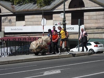 Ayudando a una señora a subir la mercancia del puesto por la cuesta del mercado.