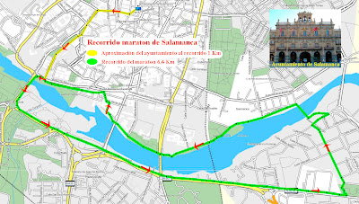 De salida una fuerte bajada por empedrado para enseguida coger un bonito camino de tierra junto al Duero, después un carril bici y regresar de nuevo al centro de Zamora. Así pues hemos dado cuatro vueltas completas para cubrir los 42,20 kilómetros en 3h 53m.