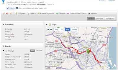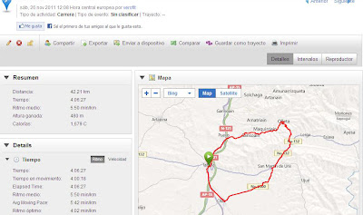 Así pues a las 9:00 se daba la salida, de inicio me he colocado con Pablo Solinís en el grupo de tres horas, pero enseguida me he dejado caer, esa no era mi guerra y además se notaba el cansancio de la semana. Después me ha cogido el amigo Manolo de Vitoria y enseguida llegarían por detrás Javier Elizari y Josu Pagola. Juntos hemos formado un bonito cuarteto y hemos pasado la media en 1h 33m. Pero enseguida de pasar la media he tenido que entrar en un bar para hacer una parada tecnica. Así pues he perdido casi cuatro minutos y al salir me ha costado un rato coger ritmo y lo peor que he perdido referencias, así pues he llegado al kilómetro 34 donde me ha cogido el amigo Txema y juntos hemos realizado los últimos ocho kilómetros a muy buen ritmo, además me ha salvado la vida pues marchaba un poco apajarado y el llevaba un gel.