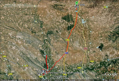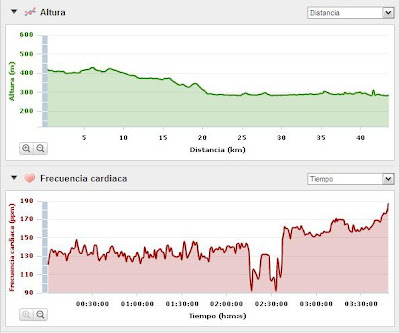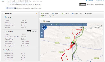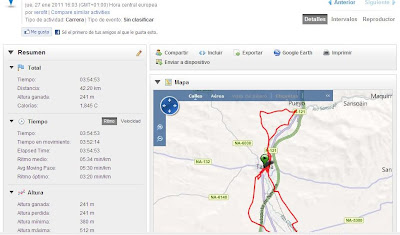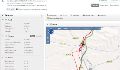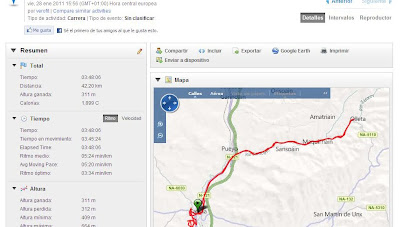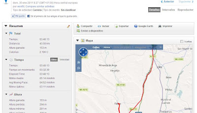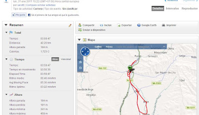 De salida he bajado por la general hasta Olite, después paso por la Variante para continuar hasta la gasolinera de Pitillas, luego he regresado a Tafalla por Beire y Olite con un fuerte viento de cara que dificultaba mucho mi marcha. Al paso por Tafalla me he comido una barrita y he continuado por el camino de Pueyo, he subido hasta el pueblo y he regresado completamente a oscuras. Al llegar a Tafalla he tenido que hacer una ultima serie de cinco kilómetros para bajar de las cuatro horas.