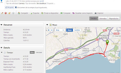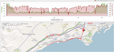 Después he continuado con unas piernas un tanto pesadas, era de esos días que las piernas dicen que no. Así que pasando más pena que gloria he estado por el paseo entre Salou y Cambrils hasta el kilómetro 38, después he subido al parque para terminar.