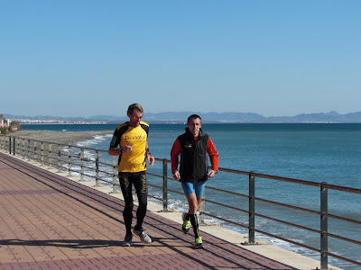 Así que sobre las 10:05 comenzábamos desde la puerta del ayuntamiento de Almería, enseguida hemos bajado en busca del Paseo junto al mar. La temperatura era de siete grados y con mucho viento. Bien escoltados por Javier Ongay en bicicleta hemos terminado el paseo hasta la Universidad, después hemos seguido por una estrecha carretera hasta las Playas de Costacabana, allí media vuelta y de nuevo hasta el Puerto.