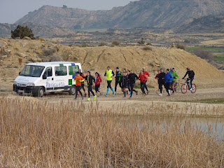A las 8:55 comenzábamos con la cuarta travesía de la Bardena blanca, de inicio ha un ritmo muy cómodo, poco a poco y con el paso de los kilómetros se ha ido acelerando la marcha para un poco antes del polígono de tiro hacer la primera parada a tomar un poco de agua, después hemos continuado con fuerte viento lateral hasta Castildetierra. Foto de familia y avituallamiento para seguir hasta el Cuartel Militar donde esperaba el autobús y varios corredores han terminado.