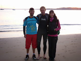 A las 8:31 comenzaba con el agua a 17 grados y muy bien guiado por Josu Oliveri y su piragua, hicimos una especie de triangulo en la bahía de 1,6 kilómetros que repetimos dos veces y después completamos los 3,8 kilómetros cerca de la playa.