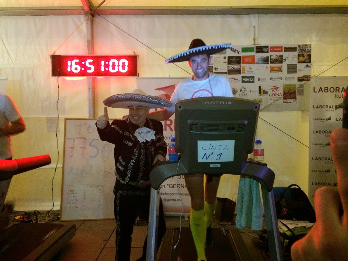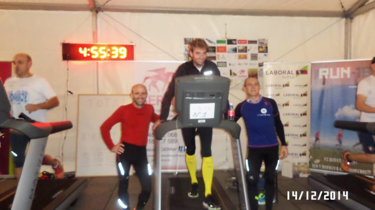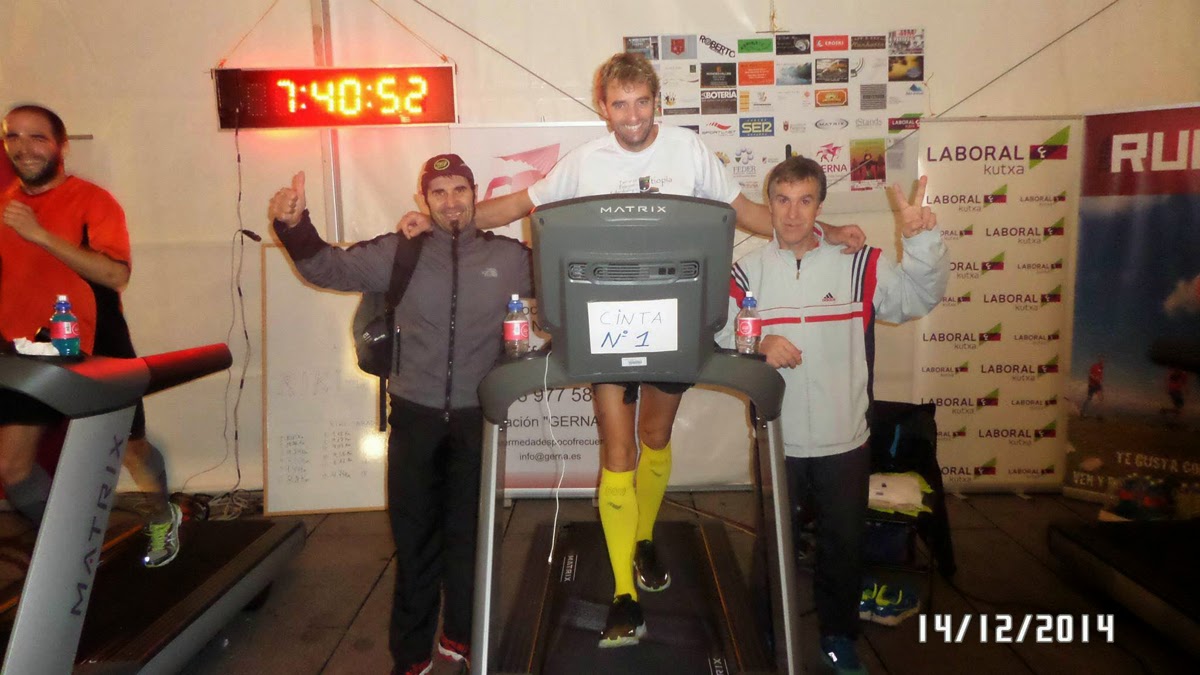 Al paso del kilómetro 100 en once horas pare a cenar, hasta entonces marchaba muy bien de fuerzas, pero después de cenar al retomar el reto vi que ya no tenia las mismas fuerzas, así que enseguida llego el calvario y una larga noche en la que a ratos corría y otros ratos caminaba, hubo momentos muy duros, sobre las 5:00 de la madrugada no podía seguir la cinta ni a tres kilómetros por hora, me tenia que agarrar a ella para no caerme, fueron momentos muy difíciles en los que pensé que no terminaría.
