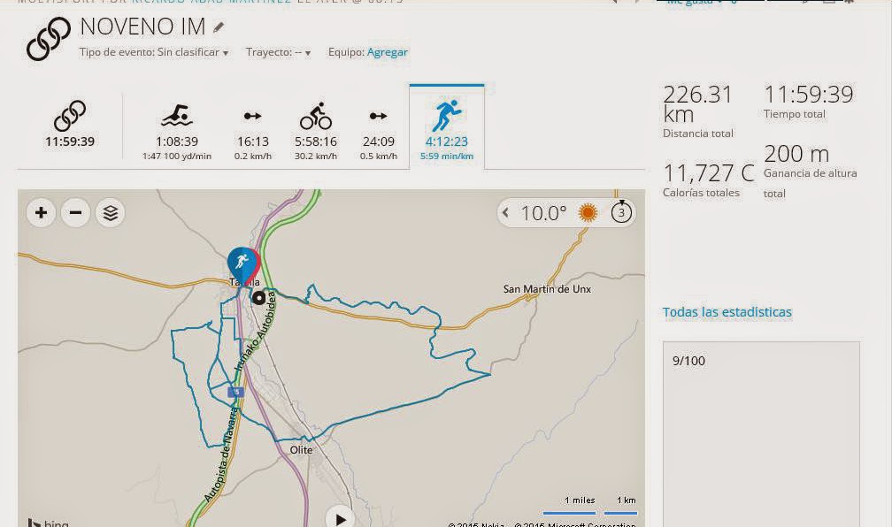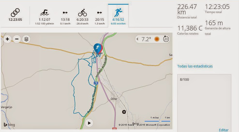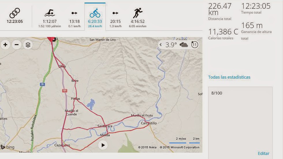 Productivo fin de semana este pasado para el reto, el sábado toco trabajar par ir teniendo días y así poder sacar adelante los muchos compromisos que me esperan. El domingo a las 9:15 comenzaba en la piscina de Tafalla con el octavo, la natación fue bien, seguidamente salí con la bici de la Ciudad Deportiva hacia Santacara, allí estuve alternando la vuelta a Traibuenas con la de la Oliva hasta completar los 180 kilómetros. La vuelta a Traibuenas ha sido un gran descubrimiento para el reto, es bastante llana y así alternando con la del Monasterio de la Oliva los kilómetros pasan antes.