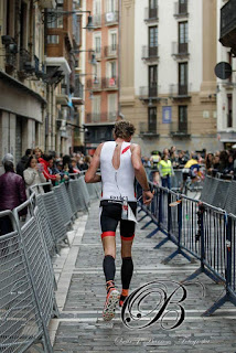 Sobre las tres de la tarde se dio la salida, en el agua logre disfrutar y salir con un crono 31:56. Seguidamente cogí la bici y a pesar de no ir demasiado cómodo en un recorrido cargado de repechos y con bastante viento logre parar el crono en 2:38 a casi 34 Km/h de media. En la media maratón toco sufrir, el centro de Pamplona estaba lleno de publico y mucha animación, esos kilómetros pasaban rápido, lo peor era la zona del paseo del Arga donde costaba mas mantener el ritmo.